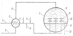 1 - сырая нефть; 2 - теплообменник; 3 - обессоленная и обезвоженная нефть; 4 - горячая вода; 5 - деэмульгатор; 6 - раствор щелочи; 7 – электродегидратор (ЭД); 8 - нефть; 9 - пара электродов; 10 - уровень раздела фаз нефть-вода; 11 - вода; 12 - переливная труба для сброса воды в канализацию.