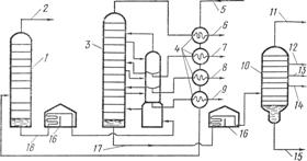 1 - предварительная отбензинивающая колонка К-1; 2 - пары нестабильного бензина; 3 - сложная ректификационная колонна К-2; 4 - теплообменники; 5 - обессоленная и обезвоженная нефть с ЭЛОУ; 6 - бензин; 7 - лигроин; 8 - керосин; 9 - соляр; 10 - вакуумная колонна К-10; 11 - газойль; 12 - веретенное масло; 13 - машинное масло; 14 - цилиндровое масло; 15 - гудрон; 16 - трубчатая печь; 17 - мазут; 18 - отбензиненная нефть.