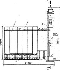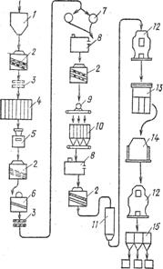 1 - черные закрома; 2 - сепараторы; 3 - магнитные сепараторы; 4 – силосы элеватора; 5 - весы; 6 - камнеотборник; 7 - куколеотборник; 8 - обойка; 9 - мойка; 10 - отлежные закрома; 11 - бункера очищенного зерна; 12 - вальцовый станок; 13 - рассеиватели; 14 - ситовейки; 15 - выбойный аппарат.
