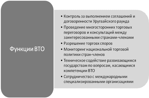 Министерская конференция (или Генсовет) | Принимать решения по всем вопросам, являющимся предметом многосторонних соглашений ВТО Назначает Генерального директора ВТО срок полномочий которого составляет 3 года. | Высший орган ВТО Конференция созывается, как правило, один раз в два года. |