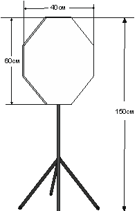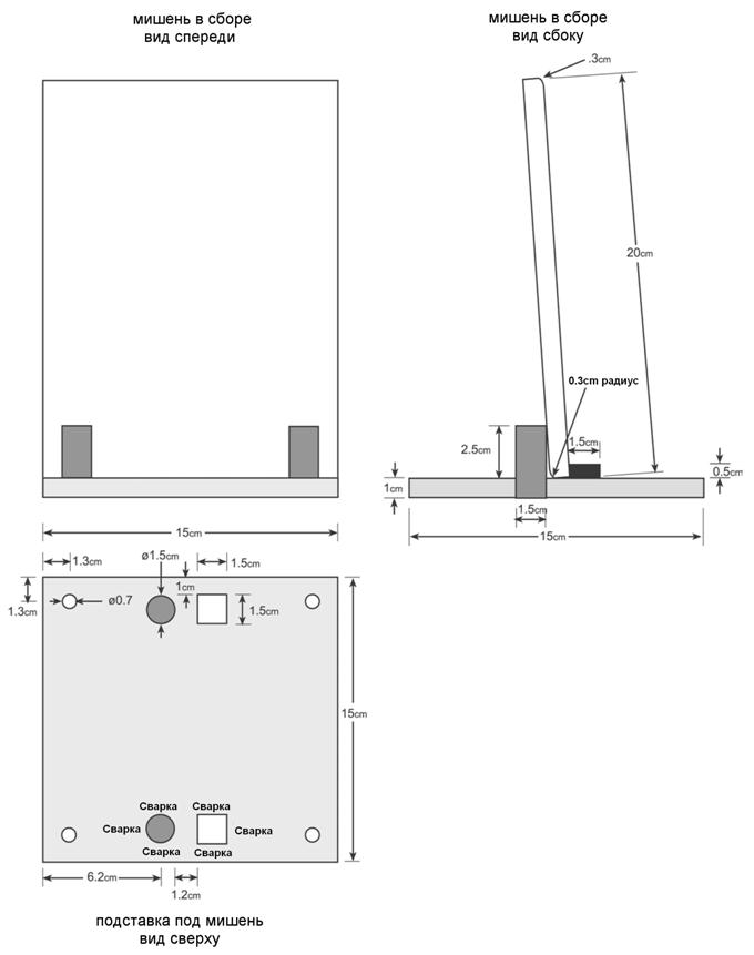 Небольшую деревянную планку (обозначенную темно-серым цветом на рисунке), примерно, 2см х 2см и, примерно, одинаковой ширины с тарелкой следует установить перед основанием, на котором закреплена тарелка, чтобы помочь предотвратить боковое разворачивание тарелки при попадании. |