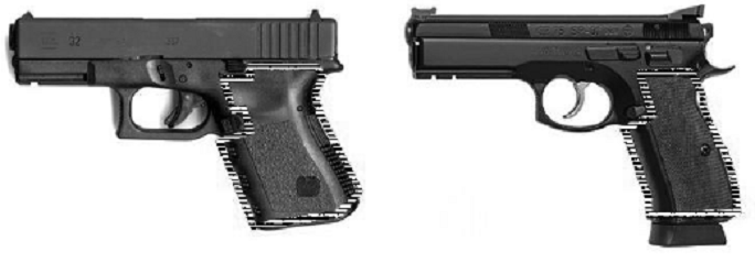 Лента может быть наложена внутри обозначенных пунктирными линиями зон, которые включают переднюю и заднюю поверхности рукояток. Однако ленту нельзя использовать для выключения клавишного предохранителя на рукоятке, ленту нельзя накладывать на любую часть затвора, спускового крючка, спусковой скобы, магазина или на любой рычаг или кнопку.