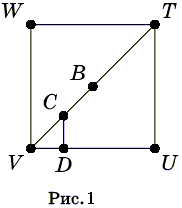 Пусть учительница находится в вершине T (рис. 1). Сначала мальчик должен плыть к противоположной вершине V. Предположим, что учительница побежит по направлению к вершине W. Пусть в тот момент, когда учительница прибежит в W, мальчик доплывёт до точки C. Пусть TW = 1. Тогда