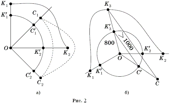 Возьмём концы этой дуги К'1, К'2, её середину К'3 и соответствующие точки берега К1, К2, К3 (рис. 2б).