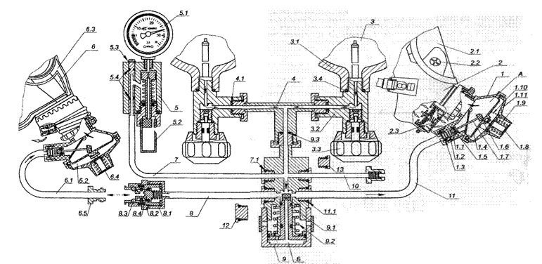 6.1- шланг, 6.2- легочный автомат; 6.3 - маска; 6.4- кнопка байпаса; 6.5-ниппель.