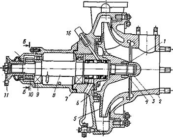 На рис. 5.11 представлен продольный разрез насоса. Он состоит из двух частей корпуса 6, крышки 2, вала 8, рабочего колеса 5, подшипников 7, 9, уплотнительного стакана 13, червячного привода тахометра 10, манжеты 12, муфты фланца 11, винта 14, пластичной набивки 15, шланга 16. Рабочее колесо 5 закреплено на валу при помощи двух шпонок 1, стопорной шайбы 4 и гайки 3.