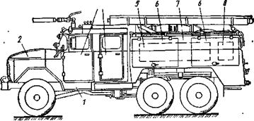 6— цистерна, 6 — отсеки кузова; 7 — кузов пожарного автомобиля,