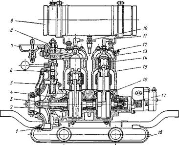 Головка цилиндров 13 и поршень 14 выполнены из алюминиевого сплава и имеют нарезное отверстие подсвечу и краны для заливки бензина в цилиндры. К головке цилиндров крепится ванна 7 для заливки воды. В головку правого цилиндра ввернут контрольный кран 12 системы охлаждения. Головка левого цилиндра через распределительный кран 6 соединена с вакуум-аппаратом 8.