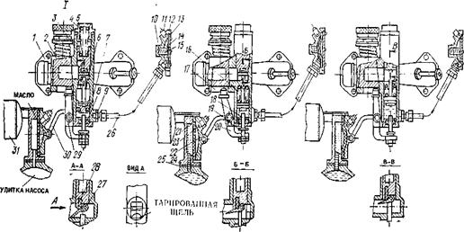 Масляная система состоит из маслопровода 30, соединяющего гидравлический диафрагменный датчик с ограничителем оборотов, с маслопроводом 26. Герметичность масляной системы достигается манжетами 7 и 8.