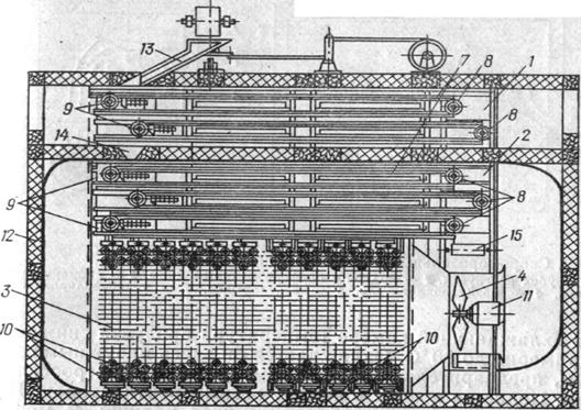 1 — камера охлаждения, 2 — камера замораживания, 3 — воздухоохладитель, 4 — вентилятор, 5 — электродвигатель привода, б — редуктор, 7 — ленточные транспортеры, 8 — приводной вал транспортера, 9 — натяжное устройство, 10 — охлаждающие батареи, 11 — электродвигатель, 12 — изолированный корпус, 13 — разгрузочно-распределительное устройство, 14 — выпускное отверстие, 15 — разгрузочный транспортер.