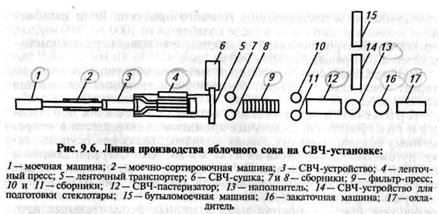 Новая технологическая схема обработки яблок включает следующие операции: мойка, инспекция, ополаскивание плодов под душеми, СВЧ-обработка, прессование (СВЧ-сушка яблочных выжимок), фильтрование, СВЧ-пастеризация сока, расфасовка сока в подготовленные и СВЧ-обработанные бутылки, укупоривание и закатка, складирование. Она позволяет получать не только сок, обладающий натуральным вкусом, ароматом и цветом, но и сокращать время его производства и утилизировать отходы (сушка выжимок).