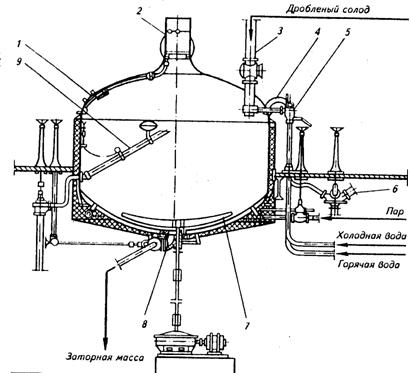 Заторный аппарат (рис. 5.12) представляет собой цилиндрический сосуд с двойным сферическим днищем, образующим рубашку, предназначенную для нагревания и кипячения заторной массы. В аппарате происходит сильное испарение и образование водяных паров, которые удаляются через вытяжную трубу 2, проходящую через потолок. Заторные аппараты снабжены раздвижным смотровым люком 1, запасными мешалками 7, стяжной трубой 9 для декантации жидкой части затора. Опорожняется котел через трубу 8. Дробленный солод по трубе 3 поступает в аппарат, по пути смачивается теплой водой из смесиАппарат имеет распределительный кран 6 для направления перекачиваемой заторной массы в соседний заторный или фильтрационный аппарат. Заторная масса из заторного аппарата возвращается по трубе 4.