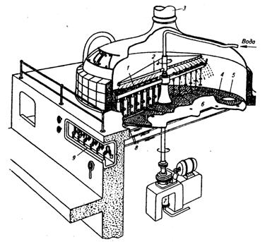 Фильтрование затора в фильтрационном аппарате. Аппарат представляет собой цилиндрический резервуар с теплоизоляцией, плоским днищем 6, сферической крышкой и вытяжной трубой 3. На расстоянии 15 мм, от днища помещено сменное фильтрационное сито 4, составленное из отдельных сегментов. На сите оседает слой дробины, для удаления которой в днище сделано отверстие 5. От нижнего дна фильтрационного аппарата отходят трубы 8 для отвода сусла. На концах этих труб насажены краны для регулирования скорости фильтрования. Концы труб из днища фильтрационного аппарата выводятся к сборному корыту. Краны вместе с корытом представляют собой фильтрационную батарею 9. Внутри аппарата находятся разрыхлительный механизм 1 и сегнерово колесо 2 (оросительный аппарат). Разрыхлительный механизм вращается от электродвигателя через коробку скоростей и редуктор, поднимается и опускается при помощи гидравлического подъемника 7. Фильтрационный аппарат снабжен регулятором разности давлений, позволяющим регулировать скорость фильтрования и указывающим разность уровней жидкости в фильтрационном баке и резервуаре регулятора. Во избежании охлаждения затора при фильтровании боковые сетки фильтрационного аппарата покрывают изоляцией.