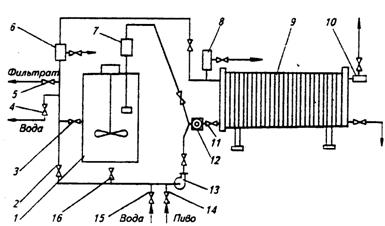 По окончании работы фильтра 9 насосом 13 при открытом кране 15 подается вода, которая через кран 5 вытеснит пиво. Вода для мойки насосом 13 при открытом кране 15 направляется в фильтр 9 и через кран 4 вытесняет разбавленное пиво в сборник исправимого брака. При рециркуляции открывают кран 2 и включают насос 13. Пиво циркулирует в замкнутом цикле.