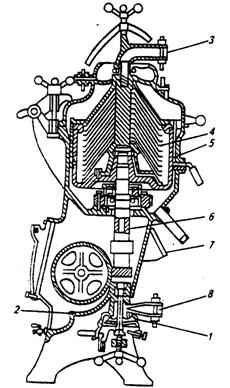 Основной частью сепаратора (см. рис. 5.15) является барабан, в котором одна под другой на расстоянии 1 мм размещены конусообразные тарелки.