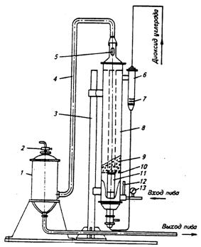 1 – сборник пива, насыщенного диоксидом углерода; 2 – кран для удаления избыточного диоксида углерода; 3 - стойка; 4 - пивопровод; 5 – смотровой фонарь; 6 – фильтр для очистки диоксида углерода; 7 – медная решетка; 8 - колонка; 9 – зона со стеклянными шариками; 10 – латунная решетка; 11 – распылители диоксида углерода; 12 – термометр; 13 – манометр.