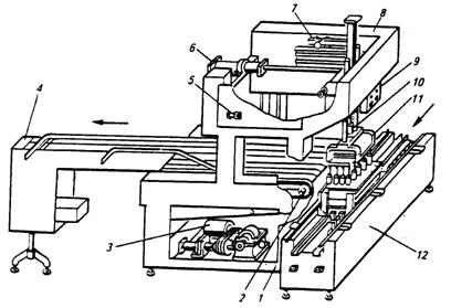 7 - пневмооборудование; 8 - пневмоцилиндр; 9 - пульт управления; 10 - направляющая головка; 11 - головка с захватами; 12 - механизм перемещения ящиков.
