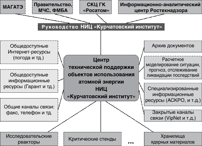 ЦТП НИЦ «Курчатовский институт» является пилотным проектом системы информационного обеспечения Ростехнадзора, которая основана на создании и развитии сети центров информационной (или технической) поддержки эксплуатирующих организаций. Внутренними клиентами для центров информационной поддержки являются пункты информационной поддержки (ИП), размещаемые на ОИАЭ. Внешними клиентами для центров информационной поддержки являются уполномоченные службы и организации: специальные службы эксплуатирующей организации, осуществляющие контроль за безопасностью, ситуационно-кризисные центры регулирующих и контролирующих органов, другие эксплуатирующие организации.
