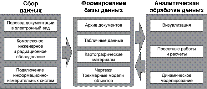 Сбор информации для создания базы данных объекта осуществляется из следующих источников: архивы документации, комплексное инженерное и радиационное обследование объектов, картографические и геодезические работы, точечные измерения, визуальное обследование, информационные системы.