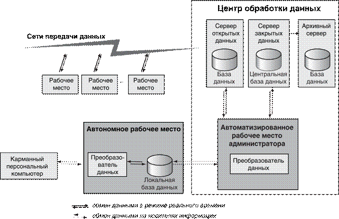 1. Центр обработки данных (ЦОД), аккумулирующий в себе весь набор информации. Доступ к данным осуществляется по локальной сети через автоматизированные рабочие места пользователей.