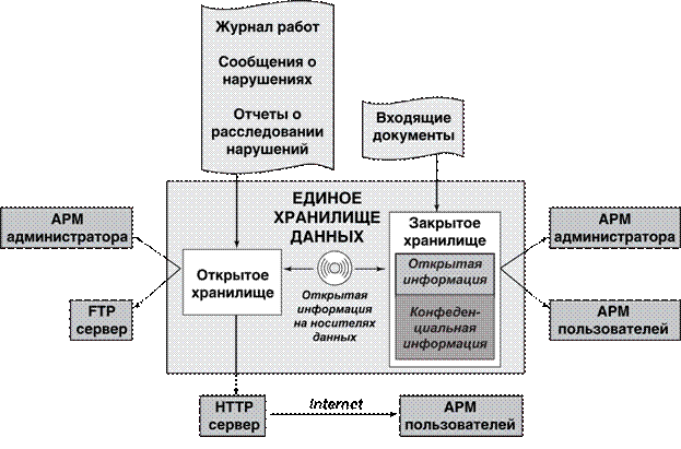 Хранилище закрытых данных изолировано от открытых сетей передачи данных. Предоставление данных хранилища пользователям осуществляется в соответствии с правами доступа. Хранилища открытых и закрытых данных имеют одинаковую структуру, что упрощает информационный обмен между ними.