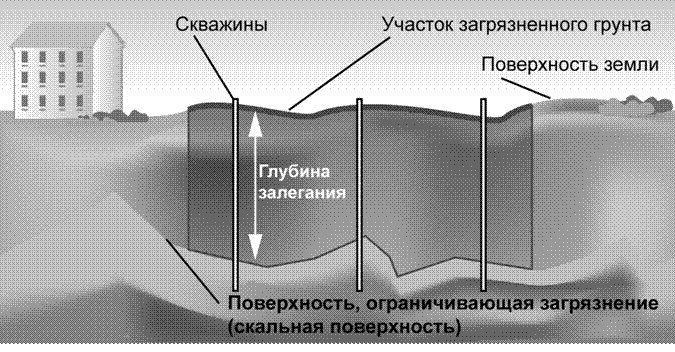 Нижняя граница радиоактивного грунта определена путем бурения контрольных скважин для определения глубины заражения с помощью дозиметрического контроля. При помощи дозиметрических исследований определена глубина загрязнения грунта для каждой из скважин, после чего на основании полученных данных построена трехмерная модель загрязненной территории для оценки загрязненности на поверхности и в вертикальном профиле грунтов. Схема расположения скважин на территории обусловлена особенностями местности и представляет собой сетку, в узлах которой располагаются скважины. Глубина бурения скважин соответствует максимально возможной глубине проникновения радионуклидов в почву и определяется характером почв данной местности.
