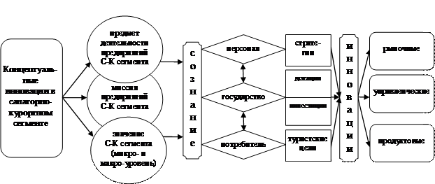 Вместе с тем, являясь сегментом туристского рынка, санаторно-курортный сегмент испытывает непосредственное воздействие современных тенденций и закономерностей инновационной деятельности в туриндустрии и в сфере услуг в целом. Поэтому для успешного функционирования данного сегмента туристского рынка наряду с технологическими процессными и продуктовыми инновациями, связанными с новыми достижениями в медицине, необходимы рыночные, организационные, или управленческие, и продуктовые инновации (немедицинского генезиса). Кроме того, в настоящее время для санаторно-курортного сегмента, как и в целом для глобальной спа-индустрии, представляется целесообразным выделение концептуальных инноваций в качестве самостоятельного типа инноваций, выполняющих базовую роль по отношению к продуктовым, рыночным и управленческим инновациям (рис. 1).