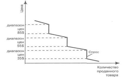 Выстраивание ценовых рядов основано на предположении, что спрос в пределах одной группы продуктов неэластичен. Если цены являются привлекательными, потребители сконцентрируют свое внимание на выборе покупок, не обращая внимания на незначительное изменение цен. Так, если линия цен на женские платья включает 85, 55 и 35 долларов (рис.), то объем продаж существенно не возрастет при установлении в пределах одного и того же ценового ряда таких цен, как 83, 53 и 33 доллара. Однако переход на следующие ряды цен, скажем, с 85 на 55 долларов, может заметно изменить спрос.