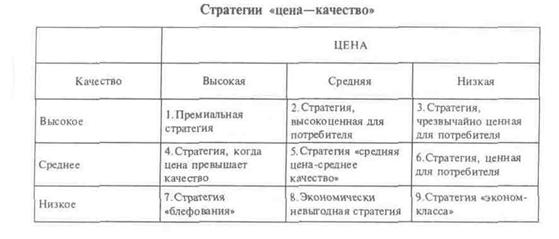 Если новый продукт не является принципиально новым, а в чем-то (например, в упаковке, дизайне) превосходит существующие продукты, в основу выбора ценовой стратегии ложится позиционирование данного продукта по качеству и цене. В таблице показаны девять возможных стратегий относительно цены и качества. Если лидер рынка следует премиальной стратегии — реализует высококачественный продукт по высокой цене (клеточка 1), то организация-новичок может создать высококачественный продукт и установить на него среднюю цену (клеточка 2), может создать продукт среднего качества и реализовать его по средней цене (клеточка 5) и т. д. Новичок должен принимать в расчет для каждой стратегии размер и скорость роста рынка и ответную реакцию конкурентов.