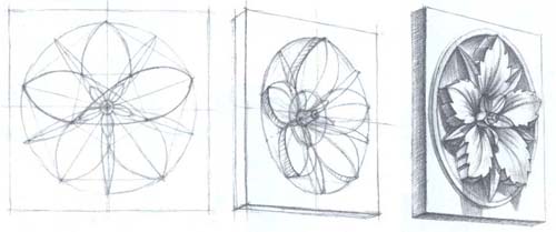орнамента гипсовой розетки следует начинать с размещения ее на листе бумаги. При этом изображение розетки необходимо начинать с прямоугольной плиты, а не самого орнамента. Для этого намечают видимую с данной точки зрения общую форму, верхние, нижние и боковые границы. Здесь необходимо отметить, что на начальной стадии построения важно правильно определить основные габаритные размеры с учетом перспективного сокращения. От того, насколько верно определены размеры плиты, во многом зависят основные пропорции орнамента и его составных элементов. Определив основные размеры плиты и ее положение в пространстве (наклонное, вертикальное), намечают ось симметрии, являющуюся базовой основой рисунка. После чего, ориентируясь на характерные точки построения, строят линии, определяющие массу орнамента, и вспомогательными линиями намечают узловые пункты лепестков и отдельных форм как у основания плиты, так и на выступающей поверхности, обозначая характерными точками основные узлы ближних элементов и перспективную отдаленность элементов, парных к ним. Это относится к рисованию модели с трехчетвертного положения.