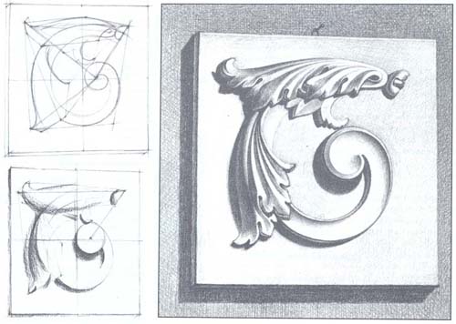 Рис. 19.Конструктивный и тональный рисунок гипсовой розетки