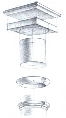 Капитель состоит из трех основных частей (рис.87). Верхняя часть, абака, представляет собой толстую квадратную плиту, которая венчается каблучком и полочкой. Под ней находится эхин, затем - переходная к колонне часть, состоящая из трех поясков или шейки, которая сопрягается со стволом колонны. Чуть ниже имеется выступающий валик с полочкой, называемый астрагалом, который также сопрягается со стволом колонны через выкружку. Если мысленно представить капитель без мелких элементов: эхина с поясками, астрагала с полочкой и без рельефа выкружки, то нетрудно определить, из каких геометрических форм состоит ее основа. Разумеется, ствол колонны состоит из цилиндра, а абака - из толстой квадратной плиты, расположенной симметрично по центру на верхнем основании цилиндра. При отдельном рассмотрении ее дополнительных элементов можно видеть, что профиль эхина близок к четвертному валу, а астрагал представляет собой тело, образованное движением шара по окружности на некотором удалении от поверхности цилиндра, с примыкающей к нему снизу полочкой. Формы капителей, независимо от их разнообразия и стилистики, в основе всегда имеют правильные геометрические формы, чаще относящиеся к телам вращения. Сочетания различных поверхностей образуют сложные формы, из-за чего рисование капители в учебном процессе относят к наиболее сложным задачам.