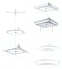 Студентам при подобных осложнениях рекомендуется начинать с построения эллипса, а затем с видимого ракурса попробовать построить на его основе абаку. Убедительность построения двух элементов зависит от правильного построения самого эллипса, что подробно рассматривалось в предыдущих заданиях по изображению геометрических тел, в частности, при построении тел вращения и их окружностей в перспективе.