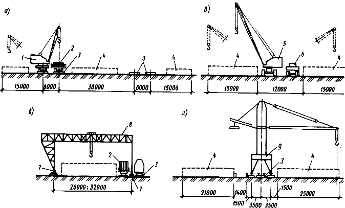 а - стреловым железнодорожным; б - стреловым гусеничным; в - козловым; г - башенным краном-погрузчиком;