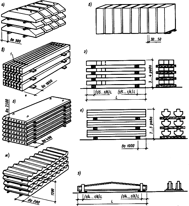 Фермы и балки (рис.2, з) перекрытий высотой более 0,6 м складируют в вертикальном или слегка наклонном положении с обеспечением упорами их устойчивости.