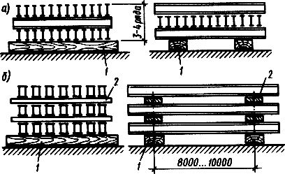 Фундаментные подушки (рис.2, а) и блоки стен подвалов располагают штабелями высотой до 2,3 м на подкладках и прокладках, которые укладывают на расстоянии 300...500 мм от торцов блоков.