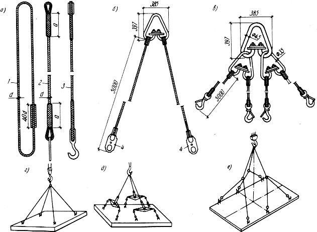 а - гибкие стропы; б - канатный двухветвевой; в - канатный четырехветвевой; г - строповка четырехветвевым стропом; д- то же, трехтраверсным; е - то же, трехблочным;