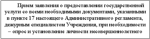 В случае выявления одного из оснований, перечисленных в пункте 21 настоящего Административного регламента, дежурный специалист Учреждения, предоставляющего государственную услугу, отказывает в помещении несовершеннолетнего в Учреждение.