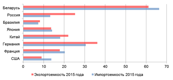 Рисунок 1. — Доля экспорта и импорта в ВВП некоторых стран в 2015 году, %