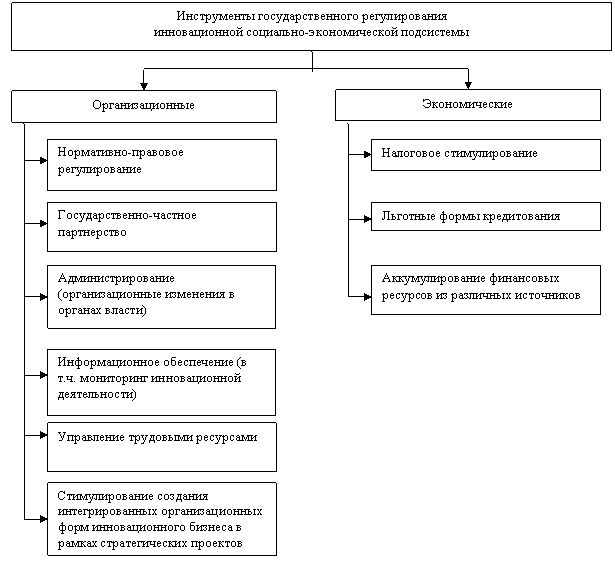 Наиболее актуальными для современной ситуации и с учетом сложившихся историко-географических, этнокультурных и экономико-политических особенностей области из множества имеющихся у государства инструментов регулирования инновационной сферы будет предлагаемый комплекс организационно-экономических механизмов формирования и развития инновационной инфраструктуры региона. Данная система инструментов государственного регулирования позволит усовершенствовать меры по реализации инновационной политики.