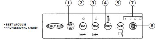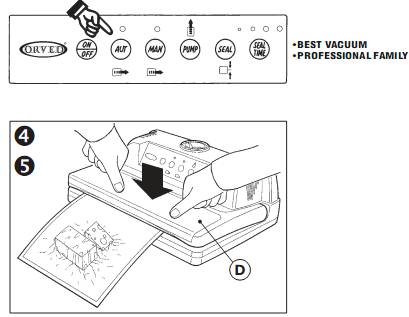 6) Включите автоматический режим упаковки (AUT), или, если вы используете механический (ручной режим), включите помпу (PUMP) проконтролируйте степень вакуумирования продукта, затем запайку пакета (SEAL).