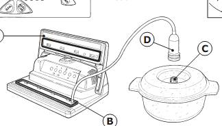 7) Поверните регулятор (2) «НАСОС» (PUMP) в положение «ВКЛ» (ON) или установите переключа«БАНКИ» (JARS) и плотно прижмите крышку (Рис.1), пока в контейнере не начнет создаваться минимальный вакуум. поднимите патрубок с наконечником (С) с крышки контейнера и прикрутите круглую гайку (В) на ниппель, чтобы предотвратить попадание воздуха в контейнер.