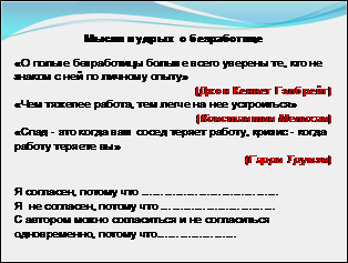 – Ребята, тема сегодняшнего занятия «Безработица». Эта тема очень актуальна, потому что из множества макроэкономических проблем безработица может стать настоящим бедствием и для государства в период экономической перестройки или кризиса, и для человека, пополнившего ряды безработных. Практически невозможно найти в мире страну, где нет той или иной разновидности безработицы. И Россия – не исключение. Угроза безработицы всегда стоит за плечами любого наемного работника, и надо представлять, откуда она возникает, сколь длительной может быть и как с ней бороться.