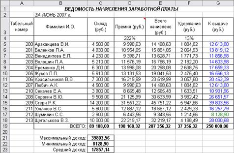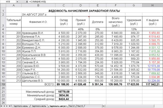 4. Измените значение Премии на 46 %, Доплаты – на 6 %. Убедитесь, что программа произвела пересчет формул (рис. 3.1).