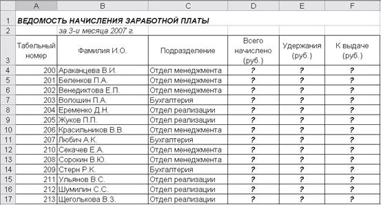 10. Вставьте новый столбец «Подразделение» (Вставка/Столбец) между столбцами «Фамилия» и «Всего начислено». Заполните столбец «Подразделение» данными по образцу (см. рис. 3.3).