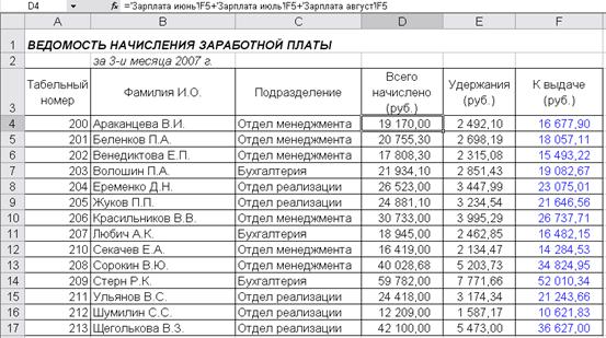 В ячейке D5 для расчета квартальных начислений «Всего начислено» формула имеет вид: = 'Зарплата июнь'!F5 + 'Зарплата июль'!F5 + 'Зарплата август'!F5.