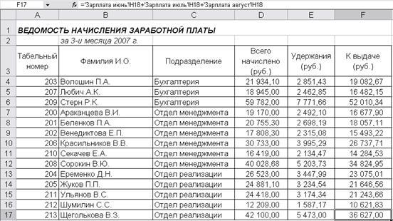 рис. 3.4. Расчет трехмесячного начисления заработной платы, связыванием листов электронной книги