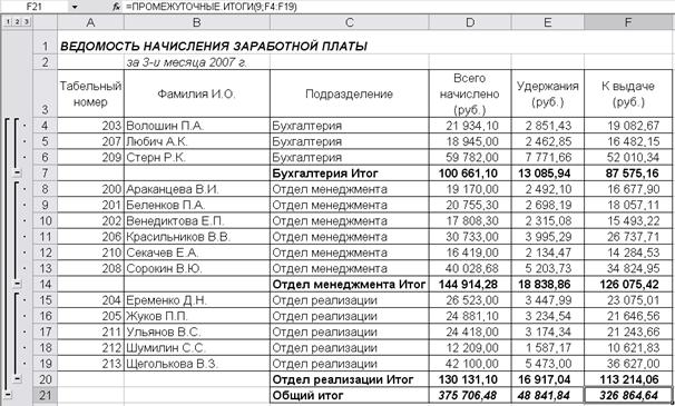 15. Изучите полученную структуру и формулы подведения промежуточных итогов, устанавливая курсор на разные ячейки таблицы. Научитесь сворачивать и разворачивать структуру до разных уровней (кнопками «+» и «-»).