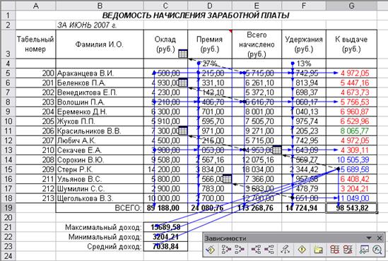 рис. 3.9. Зависимости в таблице расчета зарплаты