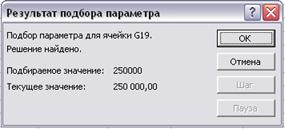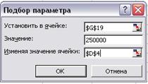 В диалоговом окне Подбор параметра на первой строке в качестве подбираемого параметра укажите адрес общей итоговой суммы зарплаты (ячейка G19), на второй строке наберите заданное значение 250000, на третьей строке укажите адрес подбираемого значения % Премии (ячейка D4), затем нажмите кнопку ОК. В окне Результат подбора параметра дайте подтверждение подобранному параметру нажатием кнопки ОК (рис. 4.2).